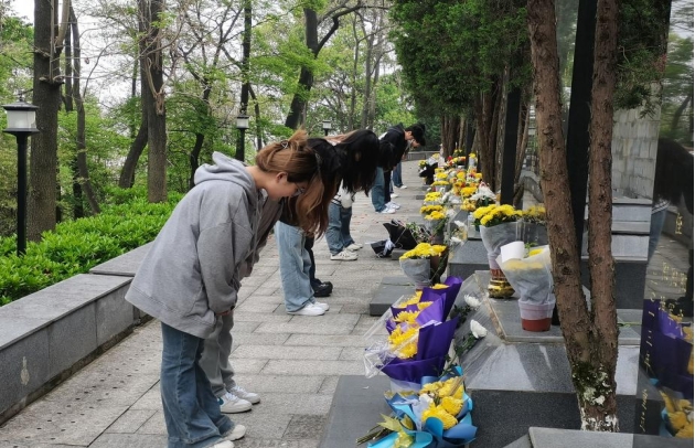 上午11点,参加祭扫活动的同学们怀着无限崇敬的心情踏上祭扫之路。在烈士陵园,同学们在革命烈士墓前庄严肃立、鞠躬默哀,向革命英烈敬献鲜花,表达对革命烈士的无限哀思和敬仰。