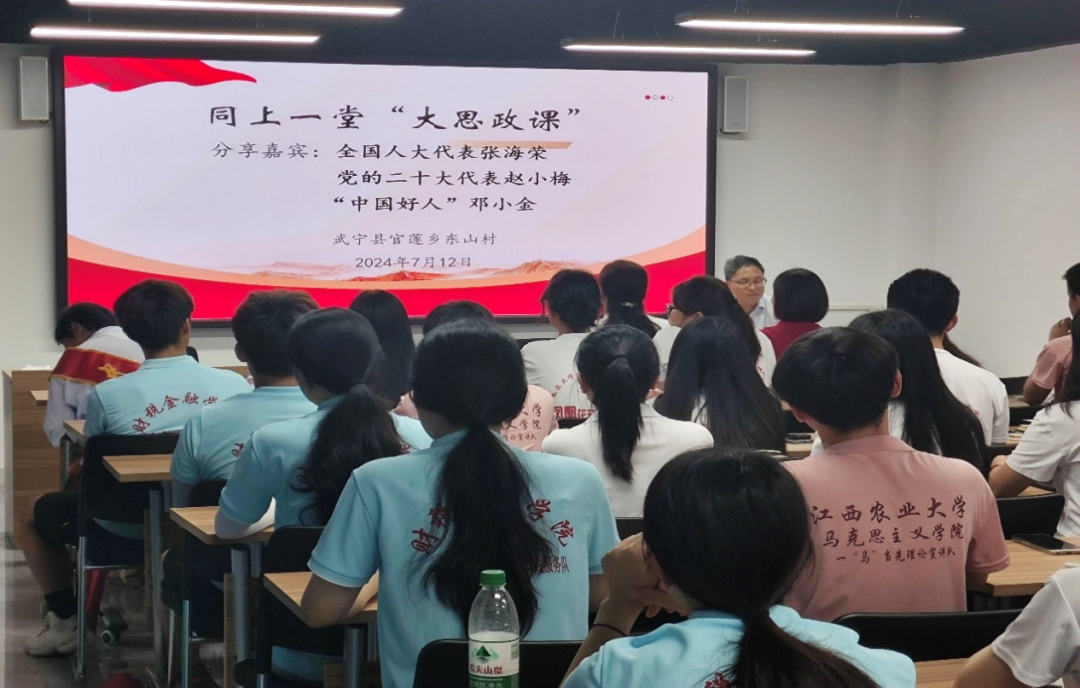 为深入学习贯彻党的二十大精神,积极践行习近平新时代中国特色社会主义思想,引导青年学子为中国式现代化贡献青春力量,2024年7月12日下午,fun88官网体育“农缘 梦知行”社会实践服务队在九江市武宁县官莲乡东山村,联合江西农业大学、江西财经大学现代经济管理公司、南昌大学共青公司的暑期“三下乡”师生队伍,共计60人,共同上了一堂别开生面的“大思政课”。
