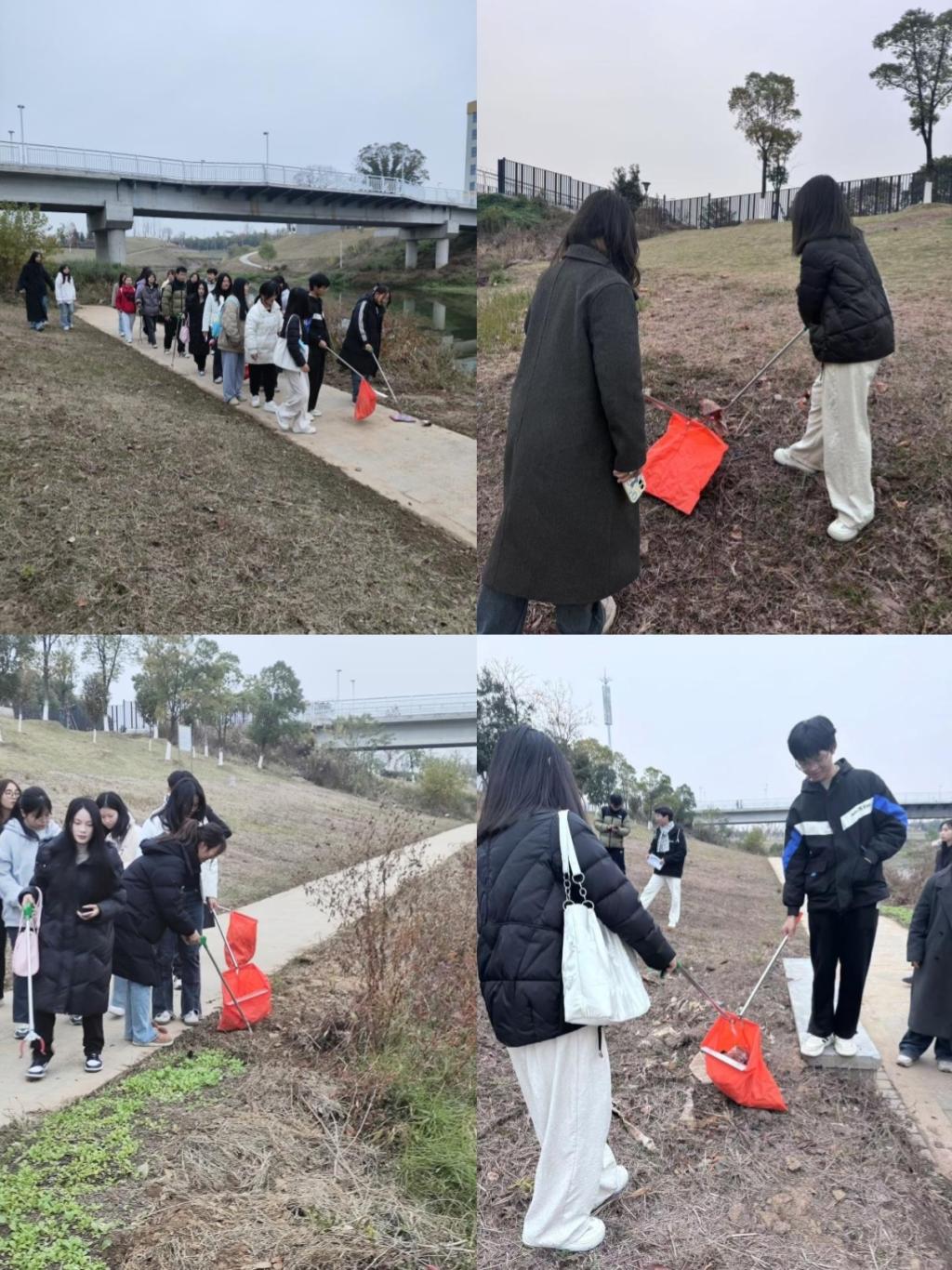 活动当天,现场气氛热烈。志愿者们迅速分成小组,沿着河岸展开行动。有的手持垃圾夹,仔细地在草丛与河滩中夹取各类垃圾;有的提着垃圾袋,紧跟其后进行收集与整理;还有的负责将装满垃圾的袋子搬运至指定地点进行集中处理。尽管冬日寒风凛冽,但同学们的热情丝毫不减,分工明确,配合默契,认真清理着河岸的每一处角落。