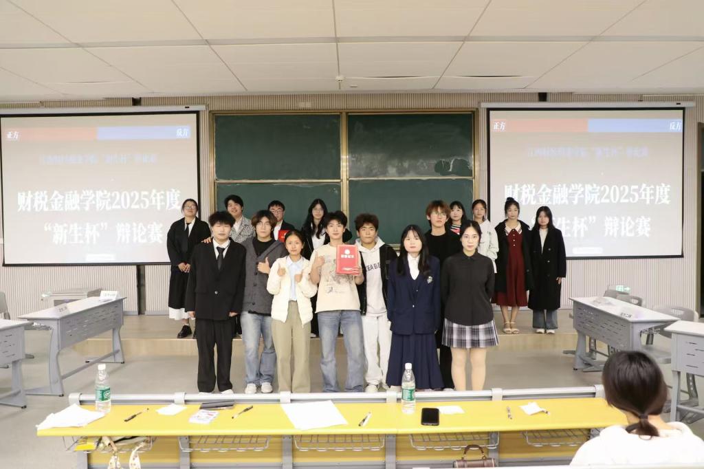 2025年10月29日星期三晚上7点“新生杯”辩论赛在二教B101成功举办。由财税辩论队队长凌梦莹,队员欧阳春艳、张嘉琪、黄浩峰担任本次比赛的评委。