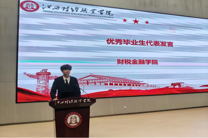 2023级金融科技应用2班徐景坤作为优秀毕业生代表发言,他回顾了在校三年的成长历程,深情感谢了母校与老师们的悉心培养,并表示无论选择专升本还是就业,都将带着所学知识与责任担当勇敢前行,服务社会,回报公司。